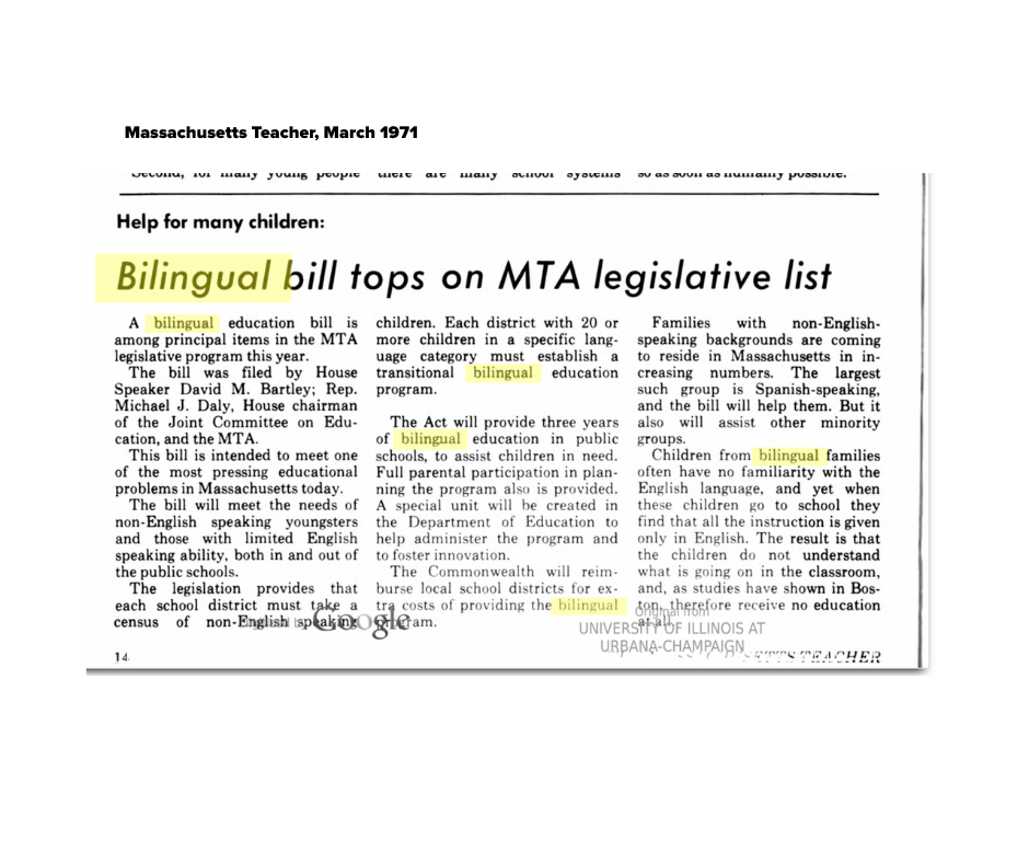 When the bill was signed by Republican Gov. Francis Sargent a few months later, it became the first mandatory bilingual education law in the country. The MTA opposed repeal of that law when an English-only mandate was approved under the so-called Unz initiative petition in 2002. That law was in turn undone when the LOOK Act was approved in 2017, with the MTA’s support. That act gives districts the option of providing bilingual education services once again.